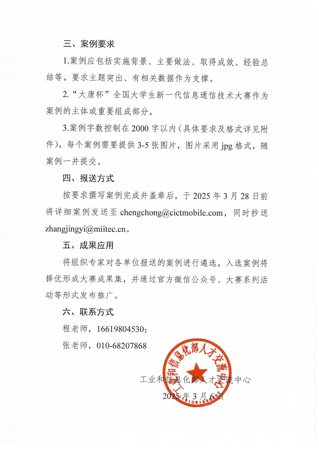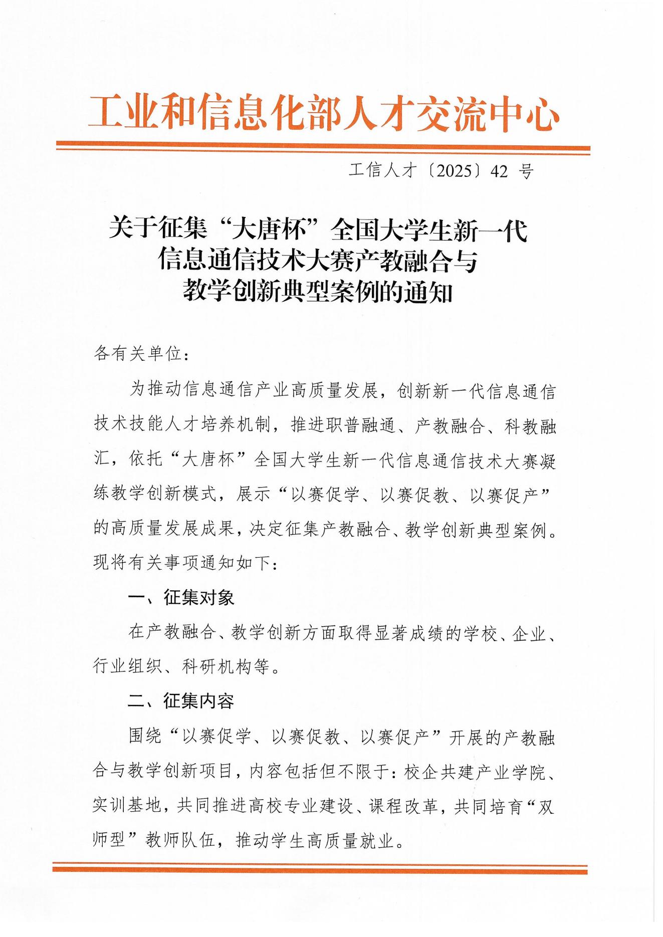 關(guan) 於(yu) 征集“大唐杯”全國大學生新一代信息通信技術大賽產(chan) 教融合與(yu) 教學創新典型案例的通知